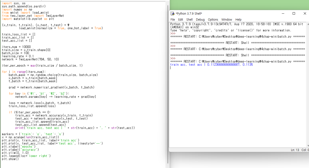 책과 결과값이 다른데, W의 매개변수를 랜덤하게 가져오기 떄문에 당연하다.
