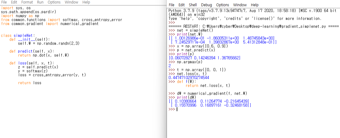 형상이 2*3인 net.W에 대한 기울기 dW를 구하는 코드.