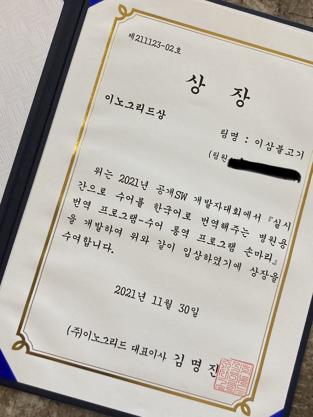 약 일년간의 프로젝트가 드디어 끝이 났다. 수상은 2주전부터 알았지만 오늘 드디어 상장이 왔다.