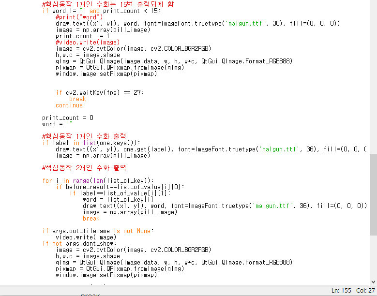 핵심동작이 1개인 단어도 있고 2개인 단어도 있다. 핵심동작이 1개인 경우, 실행속도가 너무 빨라 단어가 0.1초만에 출력되고 지나가버린다. 따라서 핵심동작 1개인 수화는 15번 프레임동안 출력되게 했다.