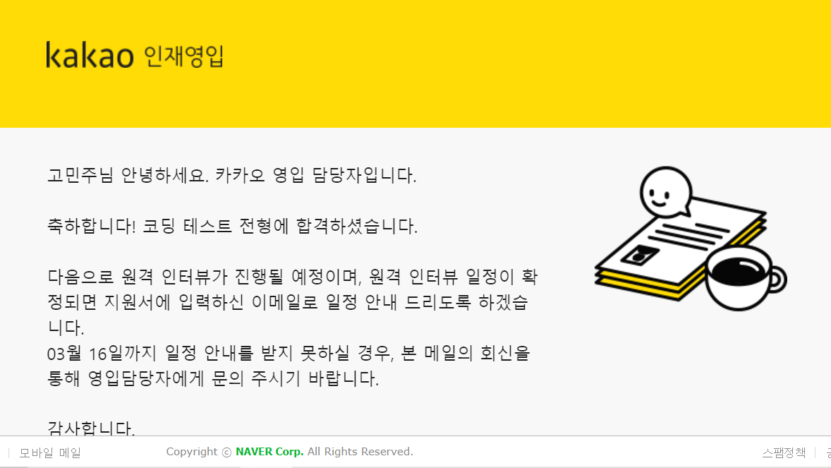 코딩테스트는 공부가 좀 필요할것 같아서 5일뒤에 봤다.