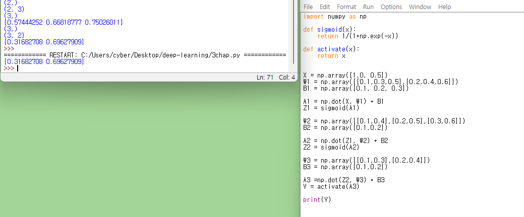 3층 신경망 중 입력층에서 1층으로 가는 과정을 구현했다.